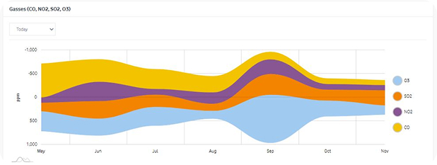 - Air Quality: Including particulate matter (PM1, PM2.5, PM10), ozone (O3), carbon dioxide (CO2), carbon monoxide (CO), ammonia (NH3), sulfur dioxide (SO2), and oxygen (O2).